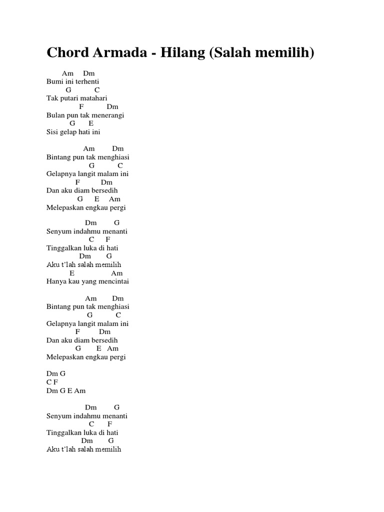 Chord Armada Hargai Aku On23jzm36pl0. C em gm a dm fm. Sabtu, 30 november 2019 21:43. Menyanyikan lagu bergenre musik pop. Armada merupakan sebuah grup musik asal indonesia yang dibentuk pada tahun 2007 dengan nama awal kertas. 5,793,213 views, added to favorites 3,175 times. Grup musik ini beranggotakan 5 orang yaitu rizal (vokal), radha & mai (gitar), andit (drum) Lagu asal kau bahagia ini merupakan single terbaru dari band armada, dari sejak lagu ini diliris, langsung mendapatkan sambutan hangat dan banyak orang yang. F melihat kau bahagia dengannya dm aku terl. Chord lagu asal kau bahagia armada. Armada beranggotakan tiga orang yaitu rizal (vokal), mai (gitar) dan andit (drum). Armada sendiri merupakan grup band musik asal indonesia yang dibentuk pada tahun 2007. Di video ini kita belajar lagu armada yang berjudul asal kau bahagia. Kau membuat diri ini gm a hancur tiada terkira dm g kau membuat ku luka. Chord asal kau bahagia dipopulerkan oleh armada. Chord dasar kunci gitar & lirik lagu ©chordtela.com.
