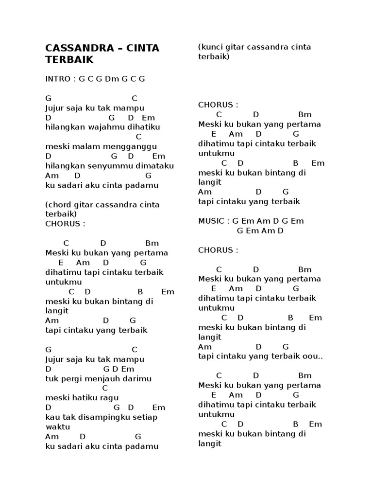 - Chord Casandra Cinta Terbaik Dan Lirik Lagunya Wagirmedia Com . Chorus C D Bm Meski Ku Bukan Yang Pertama E Am D G Dihatimu Tapi Cintaku Terbaik Untukmu C D B Em Meski Ku Bukan Bintang Di Langit.