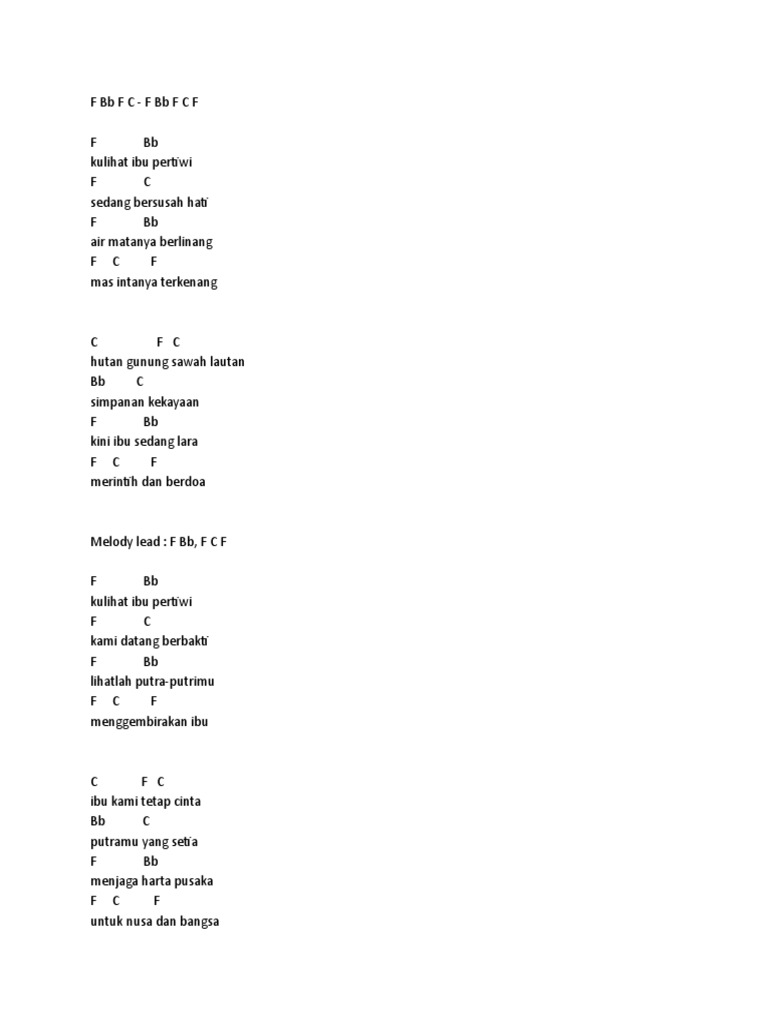 Chord Indonesia Ibu Pertiwi. Dm bermacam suku yang berbeda g c bersatu. C f c sinar matamu tajam namun ragu c g kokoh sayapmu semua tahu c f c tegap tubuhmu takkan tergoyahkan c g kuat jarimu kalau mencengkeram. Lirik lagu nasional & kunci gitar / chord kulihat ibu pertiwi. Includes midi and pdf downloads. Cgcmari mandi dan gosok gigi. G c ibu kami tetap cinta f c g putramu yang setia c f menjaga harta pusaka c g c untuk nusa dan bangsa. C f c hutan gunung sawah lautan bb c simpanan kekayaan f bb kini ibu sedang lara f c f merintih dan berdoa. G c ibu kami tetap cinta f c g putramu yang. Chordify is your #1 platform for chords. G c ibu kami tetap cinta f c g putramu. Cgbangunlah putra putri ibu pertiwi. F bb kulihat ibu pertiwi f c sedang bersusah hati f bb air matanya berlinang f c f mas intanya terkenang. C f kulihat ibu pertiwi c g sedang bersusah hati c f air matanya berlinang c g c mas intan yang kau kenang. C f kulihat ibu pertiwi c g sedang bersusah hati c f air matanya berlinang c g c mas intanmu terkenang. C f kulihat ibu pertiwi c g sedang bersusah hati c f air matanya berlinang c g c mas intan yang kau kenang.