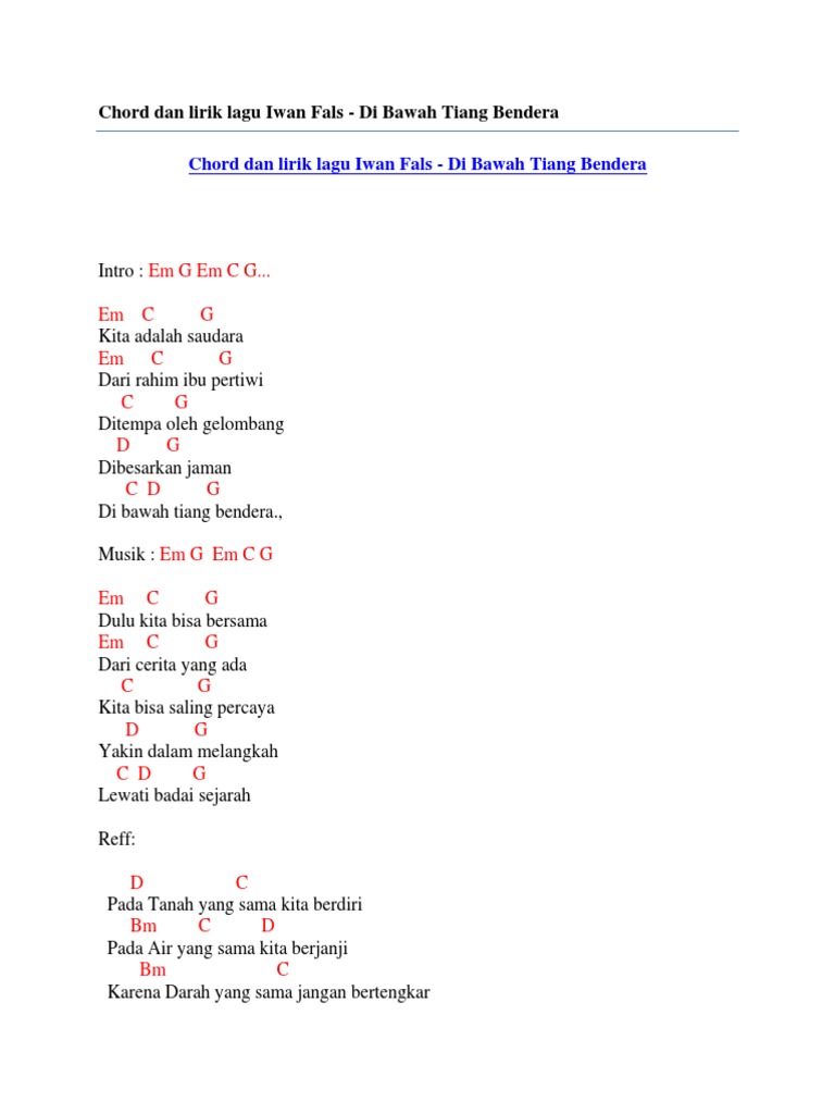 - Chord Dan Lirik Lagu Iwan Fals Di Bawah Tiang Bendera : C F C Sinar Matamu Tajam Namun Ragu C G Kokoh Sayapmu Semua Tahu C F C Tegap Tubuhmu Takkan Tergoyahkan C G Kuat Jarimu Kalau Mencengkeram.