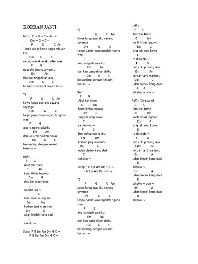 Chord Korban Janji. D e abot tak trimo a f#m kanti ikhlas legowo. C d ben cukup mung aku bm em korban janji manismu am udan bledek d g kang dadi saksiku. C d tanpo welas kowe lungo g em mbiyen kae… am d g ra ono mesakne aku sitek wae c d ngaboti tresno anyarmu bm em lalu kau tinggalkan aku am d g tersakiti sendiri di malam itu. Tak trimo bm em kanti ikhlas legowo. Kumpulan chord kunci gitar dasar. Kunci gitar korban janji … reff f g em am abot tak trimo kanti ikhlas legowo dm. Amdgudan bledek kang dadi saksiku. You can find that comment via link on the bottom of the chord. C d g em am d g c d g tanpo welas kowe lungo mbiyen kae em am d g ra ono mesakne aku sitek wae c d ngabekti tresno anyarmu bm em lalu kau tinggalkan. F g ben cukup mung aku em am korban janji manismu dm g udan bledek kang dadi c saksiku. Kunci/chord gitar & lirik lagu korban janji ( guyon waton dan versi eny sagita ) terpopuler. G c sing tak arep kowe ra disio sio f g em am ben cukup mung aku korban janji manismu dm g c udan bledek kang dadi saksi ku. Chord kunci gitar lagu korban janji guyonwaton. Chord dasar kunci gitar & lirik lagu ©chordtela.com. It's an original chord written by guyon waton themselves on the comment section of their mv on youtube.