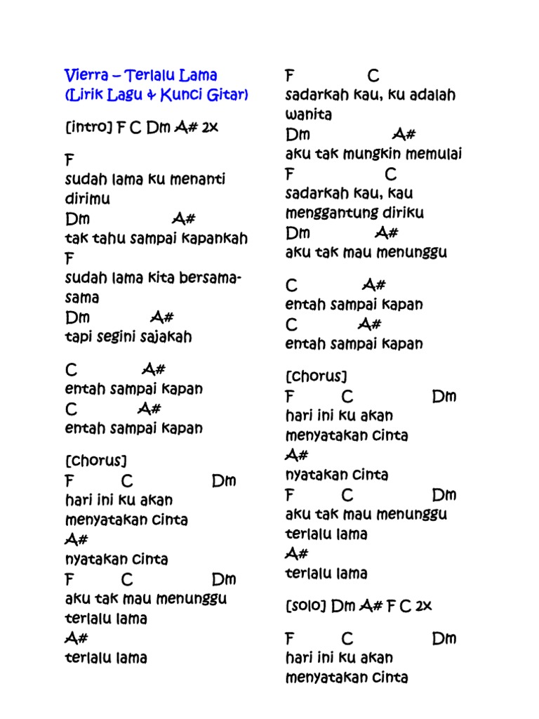 - Lirik Lagu Vierra Terlalu Lama Pdf Document , Verse A F#M Di Balik Sebuah Mimpi D Ada Sebuah Harapan E Ada Sebuah Kisah A Yang Tersimpan.