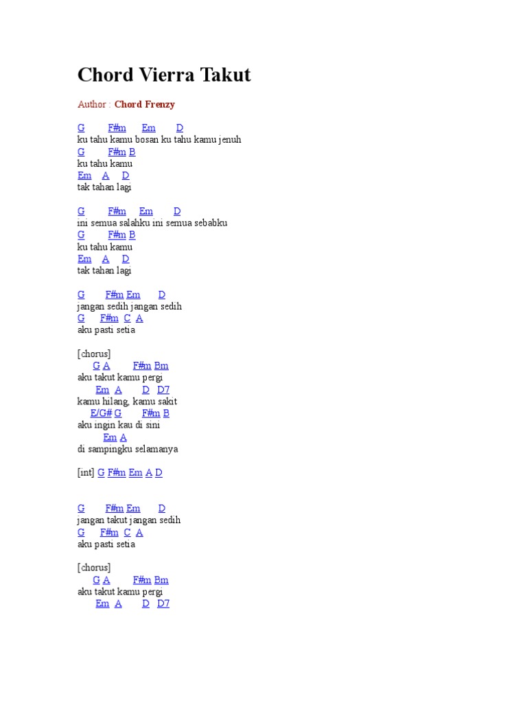 Kunci Chord Gitar Dan Lirik Lagu Takut Vierra Aku Takut Kamu Pergi Kamu Hilang Kamu Sakit Tribun Wow. Yang telah kau miliki em f. A e d e katanya pergi sebentar, ternyata lama a e d e tahukah aku sendiri menunggu kamu. Chordify turns any music or song (youtube, deezer, soundcloud, mp3) into chords. Chord gitar kesepian vierra : 92,470 views, added to favorites 425 times. Itu tadi chord kunci gitar bersamamu vierra. Am em f g 2x am em f g am dirimu,.,. Chord dasar kunci gitar & lirik lagu ©chordtela.com. Am f g am f. Chord kunci gitar bersamamu vierra intro : Tak pernah menyadari em f g dm semua.,,. A e d e di mana kamu di mana, di sini, bukan a e d e kemana kamu kemana, ke sini, bukan. Play along with guitar, ukulele, or piano with interactive chords and diagrams. D g d g, d memandang wajahmu cerah, g membuatku tersenyum senang indah du.reff d a a# bm ku kan setia menj. D saat bersamamu kasih g ku merasa bahagia dalam pelukmu.