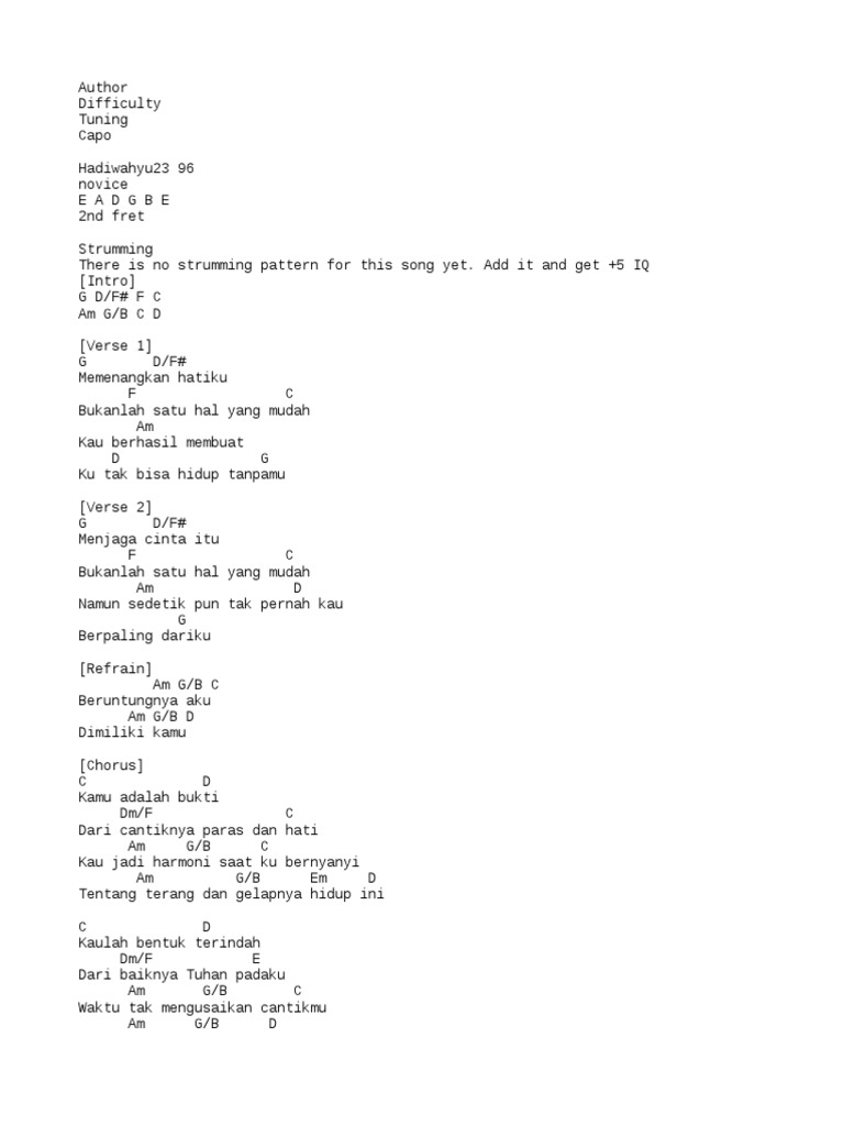 - Chord Kunci Gitar Dan Lirik Lagu Bukti Virgoun Kamu Adalah Bukti Dari Cantiknya Paras Dan Hati Tribun Solo : Capo Fret 2 Intro :