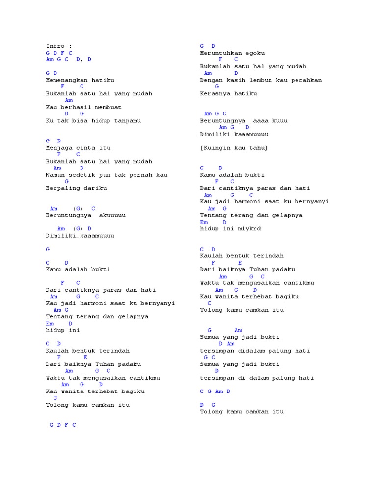 - Chord Bukti Dari G Memenangkan Hatiku Bukanlah Satu Hal Yang Mudah Kau Berhasil Membuat Kamu Adalah Bukti Dari Cantiknya Paras Dan Hat Lagu Lirik Kunci Gitar - G D Memenangkan Hatiku F C Bukanlah Satu Hal Yang Mudah Am Kau Berhasil Membuat D G Ku Tak Bisa Hidup Tanpamu.