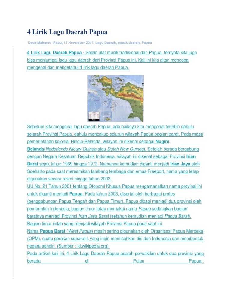 - Kumpulan Lirik Lagu Daerah . Lagu Daerah Dari Papua Adalah Papua Adalah Sebuah Provinsi Di Indonesia Yang Letaknya Disisi Paling Timur Indonesia.