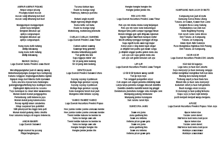 - Kumpulan Lirik Lagu Daerah , Lagu Daerah Di Indonesia, Yaitu Lagu Yang Berasal Dari Daerah Tertentu Dengan Budaya Di Wilayah Tersebut.