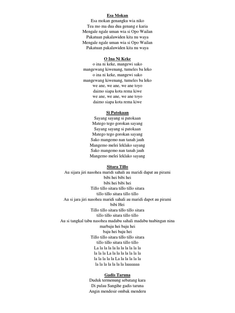 - O Ina Ni Keke Lagu Daerah Sulawesi Utara Lirik Dan Terjemahan Youtube . Selain Lagu O Ina Ni Keke, Si Patokan Pun Menjadi Salah Satu Lagu Daerah Dari Sulawesi Utara Yang Cukup Populer.