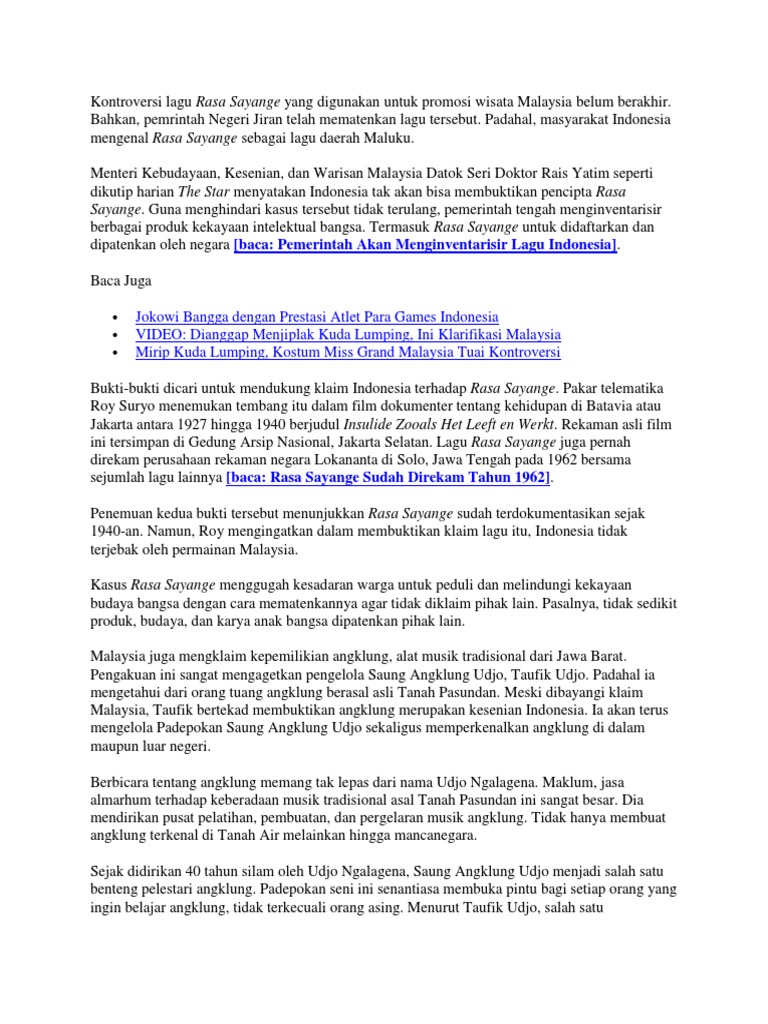 - Kontroversi Lagu Rasa Sayange Yang Digunakan Untuk Promosi Wisata Malaysia Belum Berakhir , Berikut Ini Alat Music Yang Berasal Dari Daerah Banyumas Adalah.a.