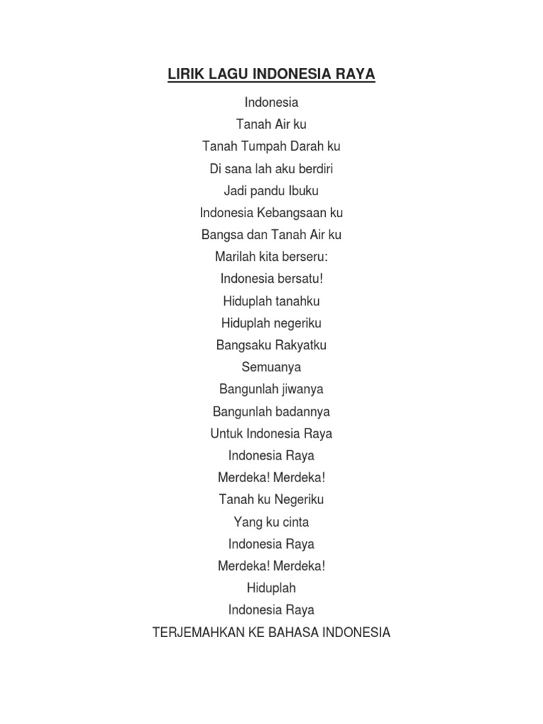 - Lirik Lagu Kebangsaan Indonesia Raya Dalam 3 Stanza Kurikulum Pelajaran . Indonesia Tanah Airku Tanah Tumpah Darahku Disanalah Aku Berdiri.