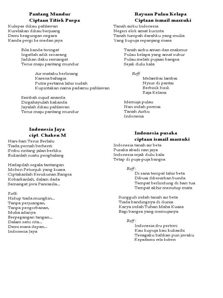 - Lirik Lagu Nusantara Kupu Kupu Lirik Lagu Nusantara Kupu Kupu Lagu Daerah Beserta Not Cute766 - Indonesia Tanah Airku Tanah Tumpah Darahku Disanalah Aku Berdiri Jadi Pandu Ibuku Indonesia Kebangsaanku Bangsa Dan Tanah Airku Marilah Kita Berseru Indonesia.