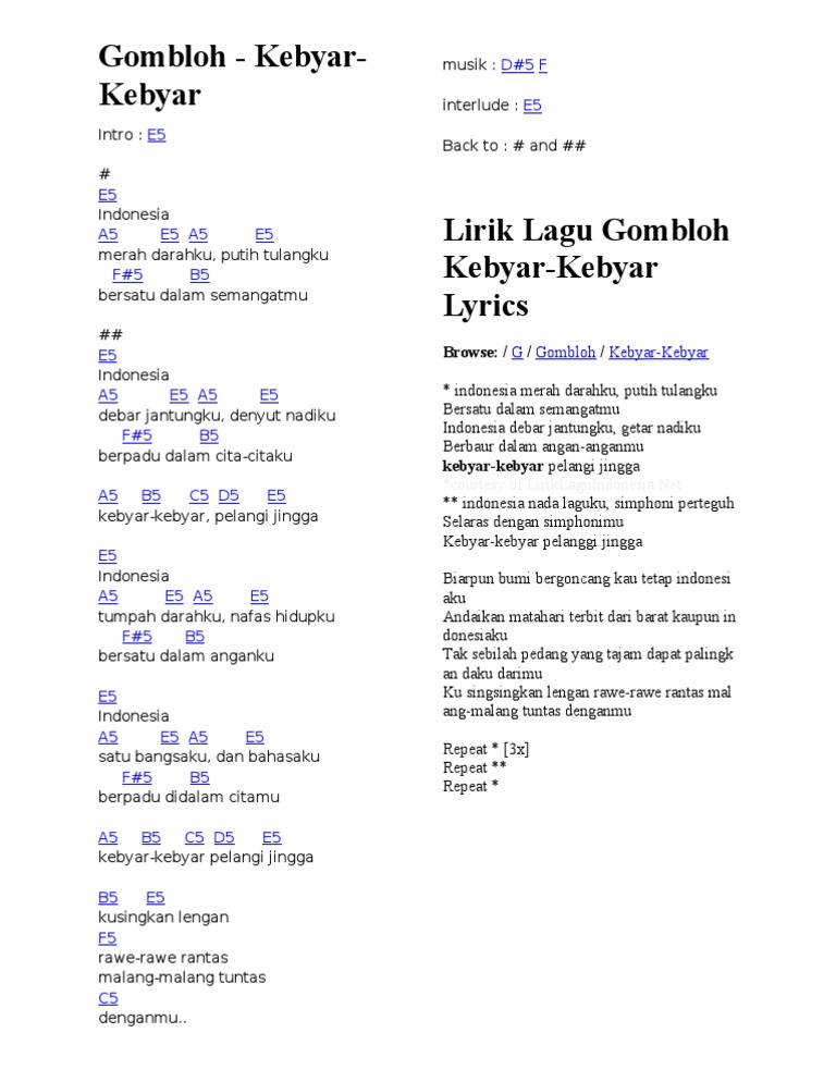 - Notasi Dan Lirik Lagu Kebyar Kebyar Karya Gombloh Lagu Nasional Indonesia Senibudayasia , Lagu Ini Sangat Nasionalisme Dan Patut Untuk Dinyanyikan Agar Selalu Memupuk Rasa Nasionalisme Agar Terpatri Dalam Di Dalam Jiwa Warga Negara Indonesia.