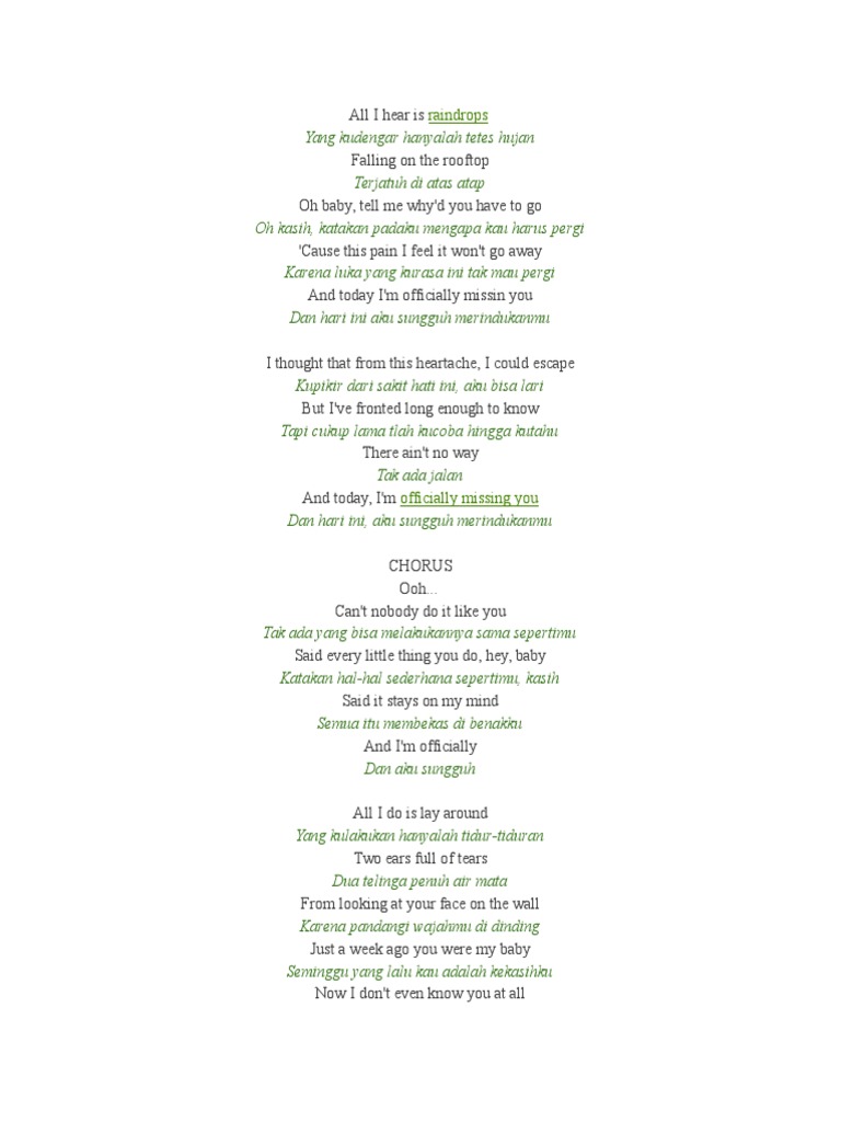 - Officially Missing You Chords - All I Hear Is Raindrops Yang Kudengar Hanyalah Tetes Hujan Falling On The Rooftop Terjatuh Di Atas Atap Oh Baby, Tell Me Why'd You Have To Go Oh Kasih, Katakan Padaku Mengapa Kau Harus Pergi 'Cause This Pain I Feel It Won't Go Away Karena Luka Yang Kurasa Ini Tak Mau Pergi And Today I'm Officially Missin.
