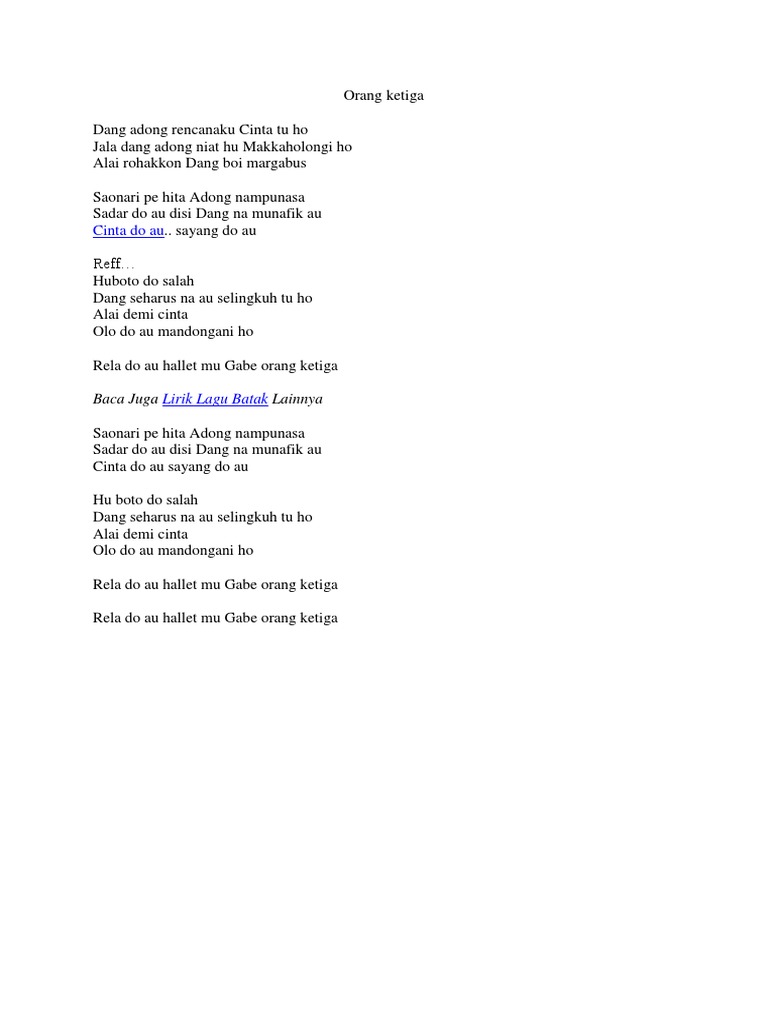 - Lirik Lagu Batak Dan Chord Orang Ketiga , Baca Juga Lirik Lagu Batak Lainnya.