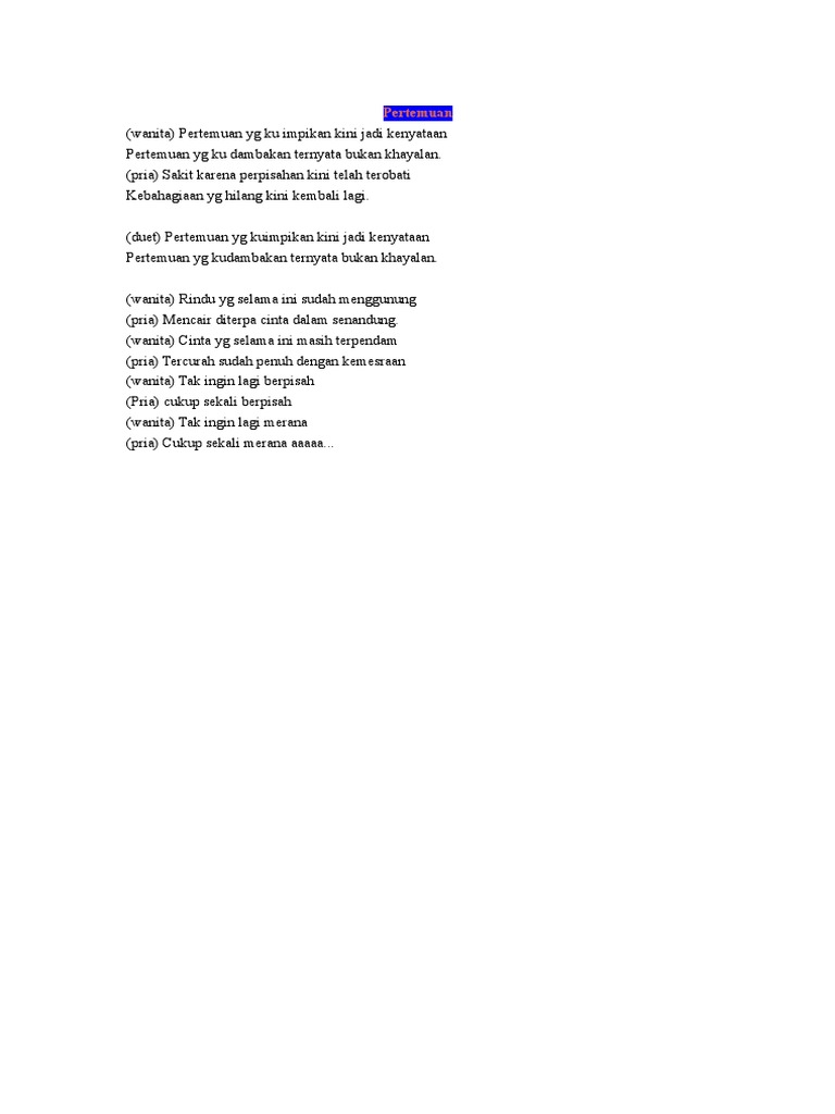 Lirik Lagu Pertemuan Indeed recently has been sought by users around us, maybe one of you personally. Individuals are now accustomed to using the net in gadgets to see video and image information for inspiration, and according to the title of this article I will discuss about Lirik Lagu Pertemuan.