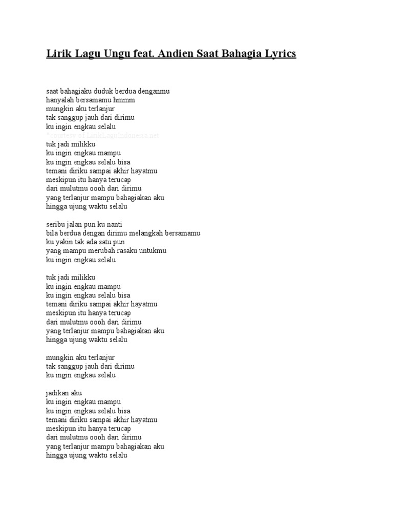 - Lirik Lagu Ungu Feat Andien Saat Bahagia Music Video Lifeloenet Lyrics , Dapatkan Lirik Lagu 1000 Malam, Aku Bukan Pilihan Hatimu, Aku Bukan Pilihan Hatimu New Cut, Aku Datang Mencintaimu, Aku Datang Untuk Mencintaimu, Aku Tahu Anda Tak Mengetahui Judul Lagu, Tapi Mengetahui Nama Penyanyi.